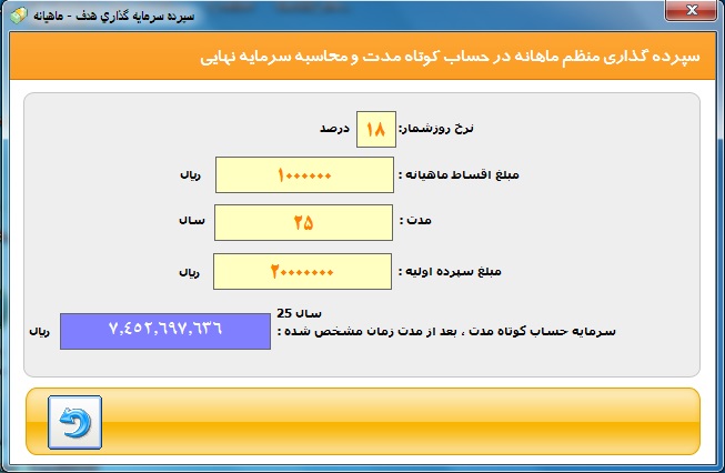 اگر می خواهید بدانید که چطور واریزی های اندک ماهانه یا سالیانه شما به حسابهای کوتاه مدت بانکی طی سالهای آینده تبدیل به یک سرمایه بزرگ می شود از این مجموعه نرم افزاری حتماً استفاده نمایید.