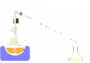 ظرف تقطیر را با چراغ گاز حرارت دهید. چراغ را طوری قرار دهید که نوک شعله با توری سیمی تماس پیدا کند یا درست زیر آن باشد، و شعله را از جریان باد محفوظ نگه دارید به نحوی که بتوانید حرارت را تا حد ممکن به دقت تنظیم کنید. به مجردی که محلول شروع به جوشیدن کرد و بخارهای رفلاکس شده به گرما سنج رسید، شعله را طوری میزان کنید که تقطیر فقط با سرعتی در حدود یک قطره مایع مقطر در هر یک یا دو ثانیه به طور یکنواخت ادامه یابد. اولین مایع مقطر را در ظرف گیرنده (الف) جمع آوری کنید. وقتی که درجه حرارت دهانه خروجی به 80 درجه رسید، ظرف گیرنده (الف) را با ظرف گیرنده (ب) و در 105 درجه آن را با ظرف گیرنده (ج) عوض کنید.