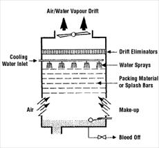 هوای بیرونی از طریق منافذی که بصورت میله های افقی در اطراف برج قرار دارند وارد می شوند . این میله ها بمنظور نگهداری آب در داخل خود بطرف پائین مایل هستند . در اثر اختلاط آب و هوا ، انتقال حرارت و انتقال جرم اتفاق افتاده و در نتیجه آب سرد می گردد . آب سرد شده در حوضچه بتنی که در انتهای برج قرار دارد جمع آوری شده و سپس بطرف کندانسور پمپ می شود . اکنون هوای مرطوب و گرم از بالای برج خارج می گردد .