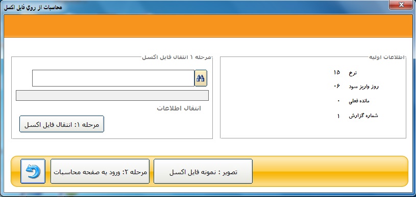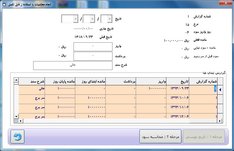 و یا اینکه شما می توانید مجموعه واریز و برداشت های خود را در یک فایل اکسل که نمونه آن در نرم افزار موجود می باشد وارد نموده و یا به شکل ان تنظیم نموده و پس ورود آن به نرم افزار سود نهایی + مانده را در قالب فایل اکسل تحویل بگیرید.